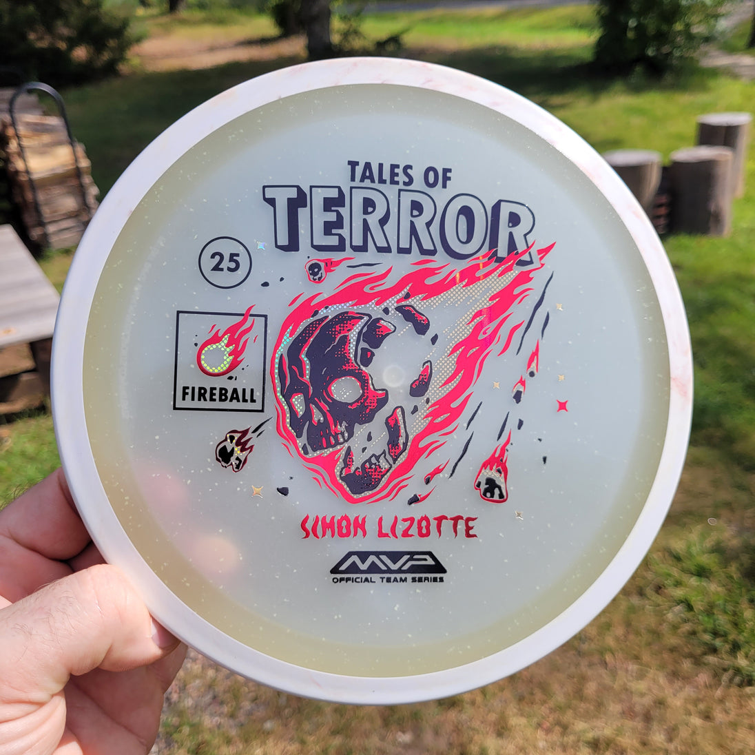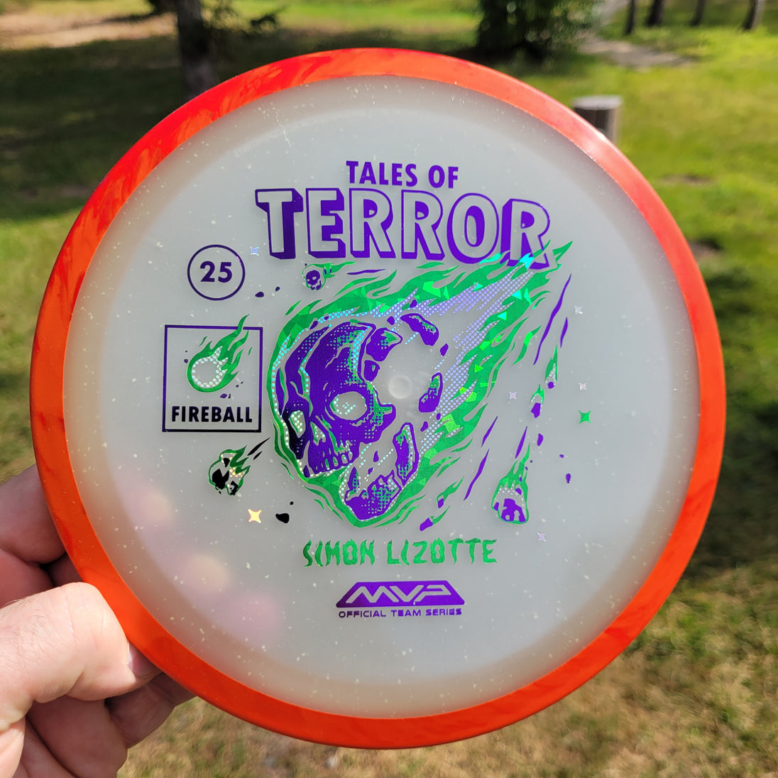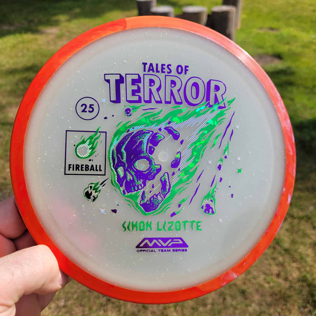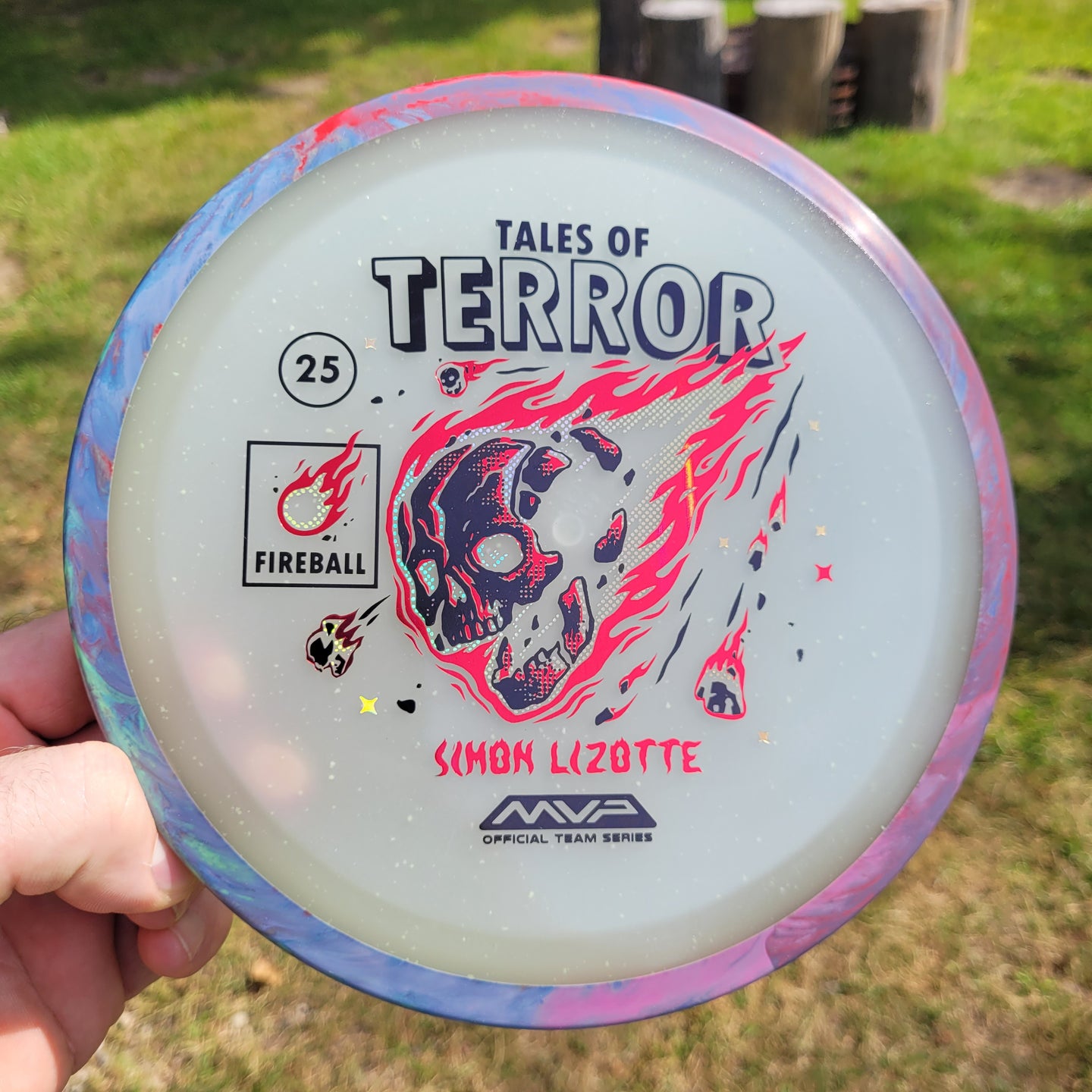 Our first release in our new Particle Eclipse plastic is the Particle Eclipse Fireball! Hurtling towards a catastrophic fate in this stamp brought to us by Matthew Jorde, this flaming doom has never looked better. Made with our industry-leading Eclipse plastic, this new blend of glow with colorful particles inside accentuates the otherworldly feel of this space faring skull about to rain down upon us. Equally suited to backhands and forehands, the Fireball is an overstable driver perfect for wind fighting and situations when you need the dependable hook of its high fade for accurate placement shots. Wreak havoc on the course by grabbing your own Particle Eclipse Fireball today!
