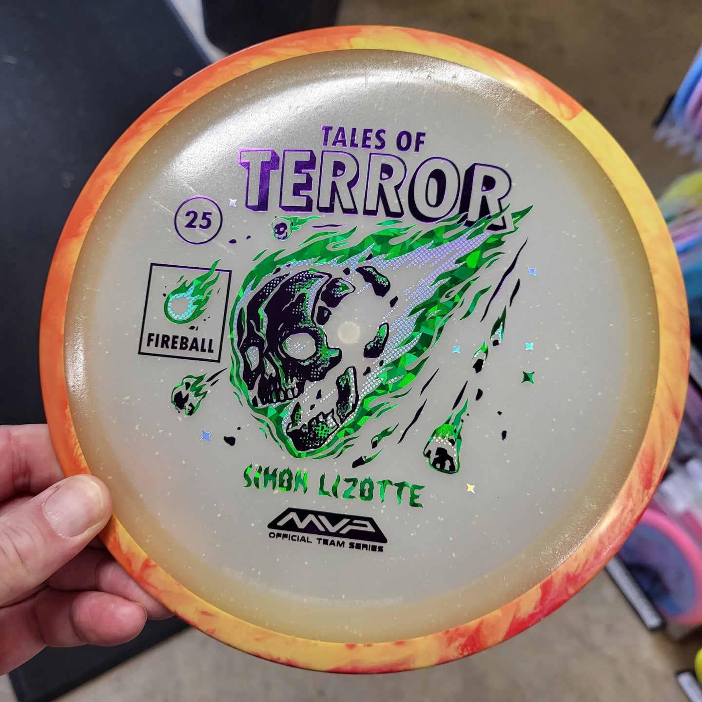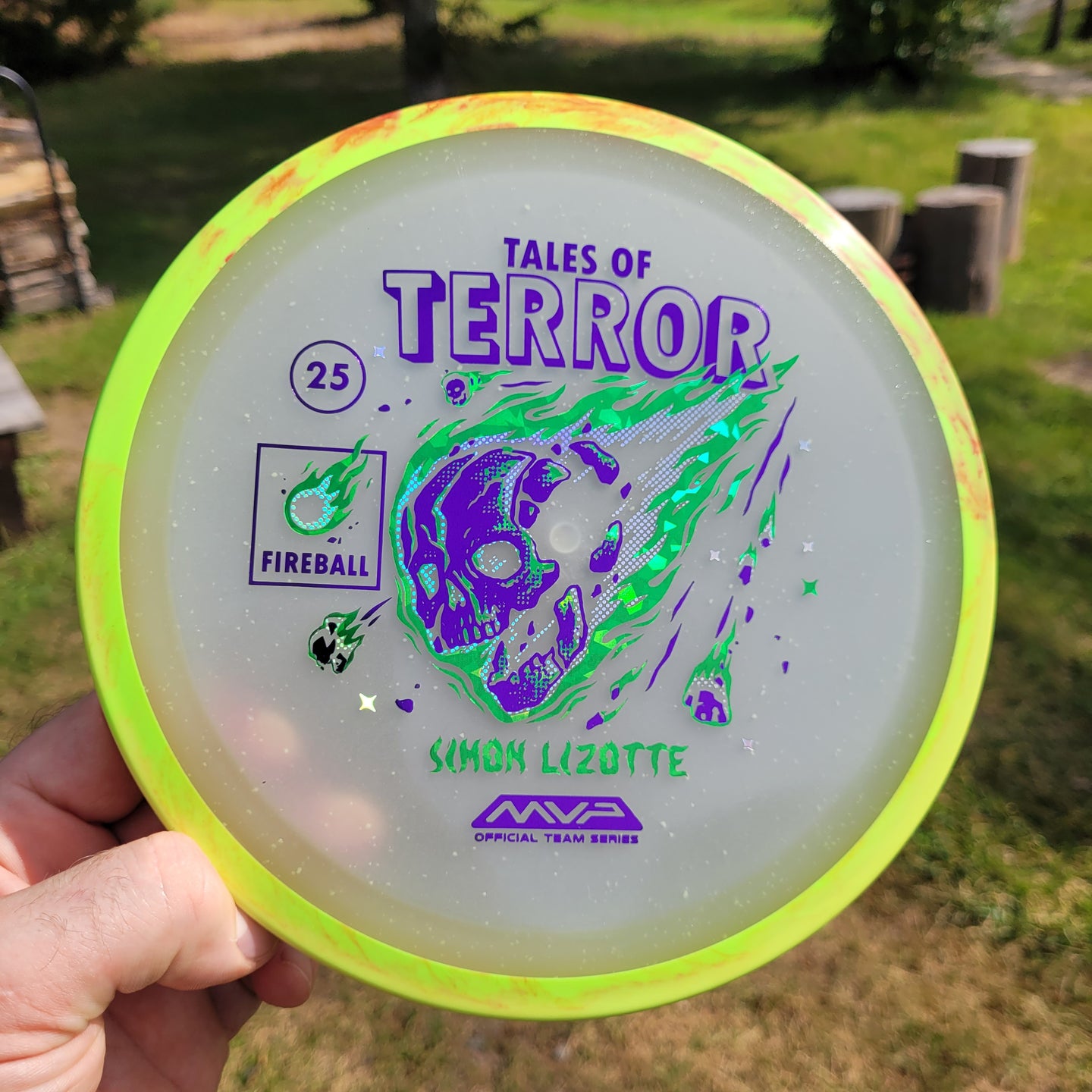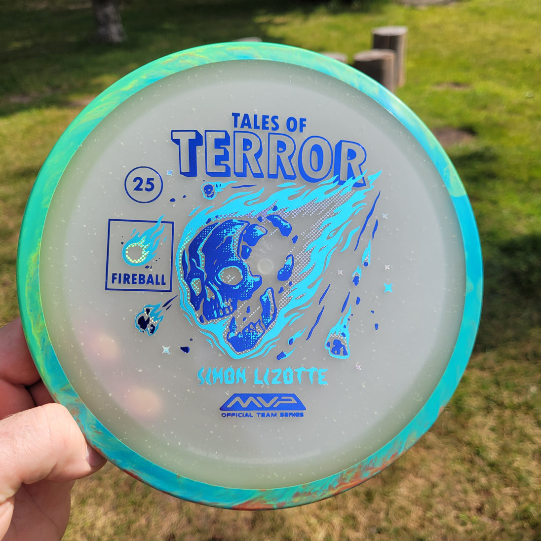 Our first release in our new Particle Eclipse plastic is the Particle Eclipse Fireball! Hurtling towards a catastrophic fate in this stamp brought to us by Matthew Jorde, this flaming doom has never looked better. Made with our industry-leading Eclipse plastic, this new blend of glow with colorful particles inside accentuates the otherworldly feel of this space faring skull about to rain down upon us. Equally suited to backhands and forehands, the Fireball is an overstable driver perfect for wind fighting and situations when you need the dependable hook of its high fade for accurate placement shots. Wreak havoc on the course by grabbing your own Particle Eclipse Fireball today!