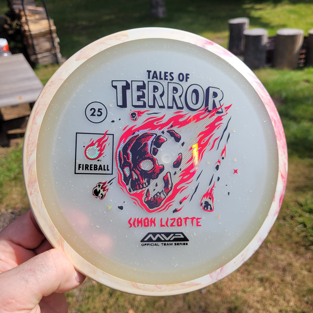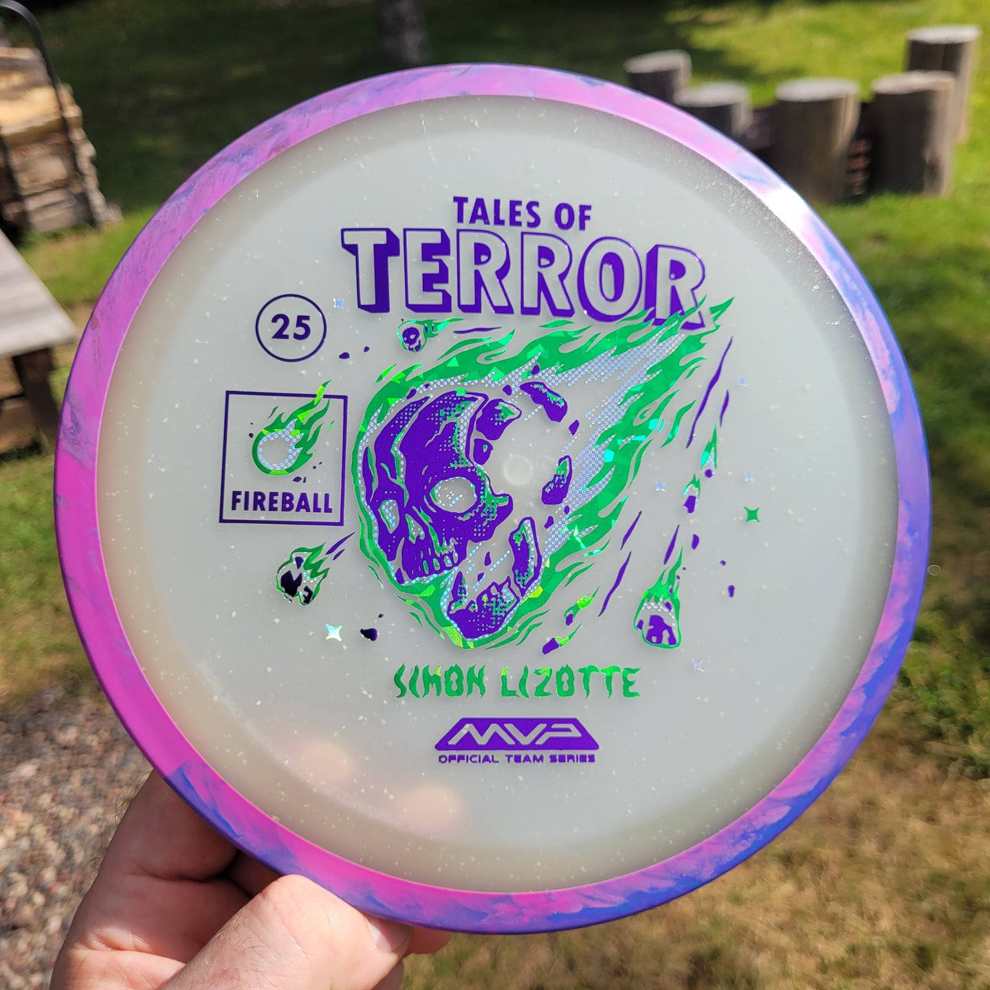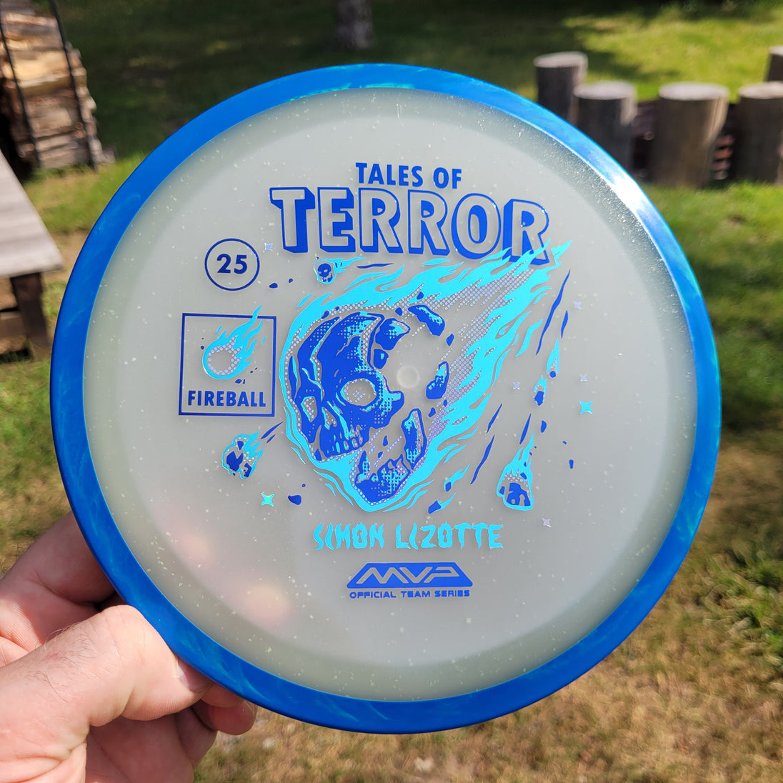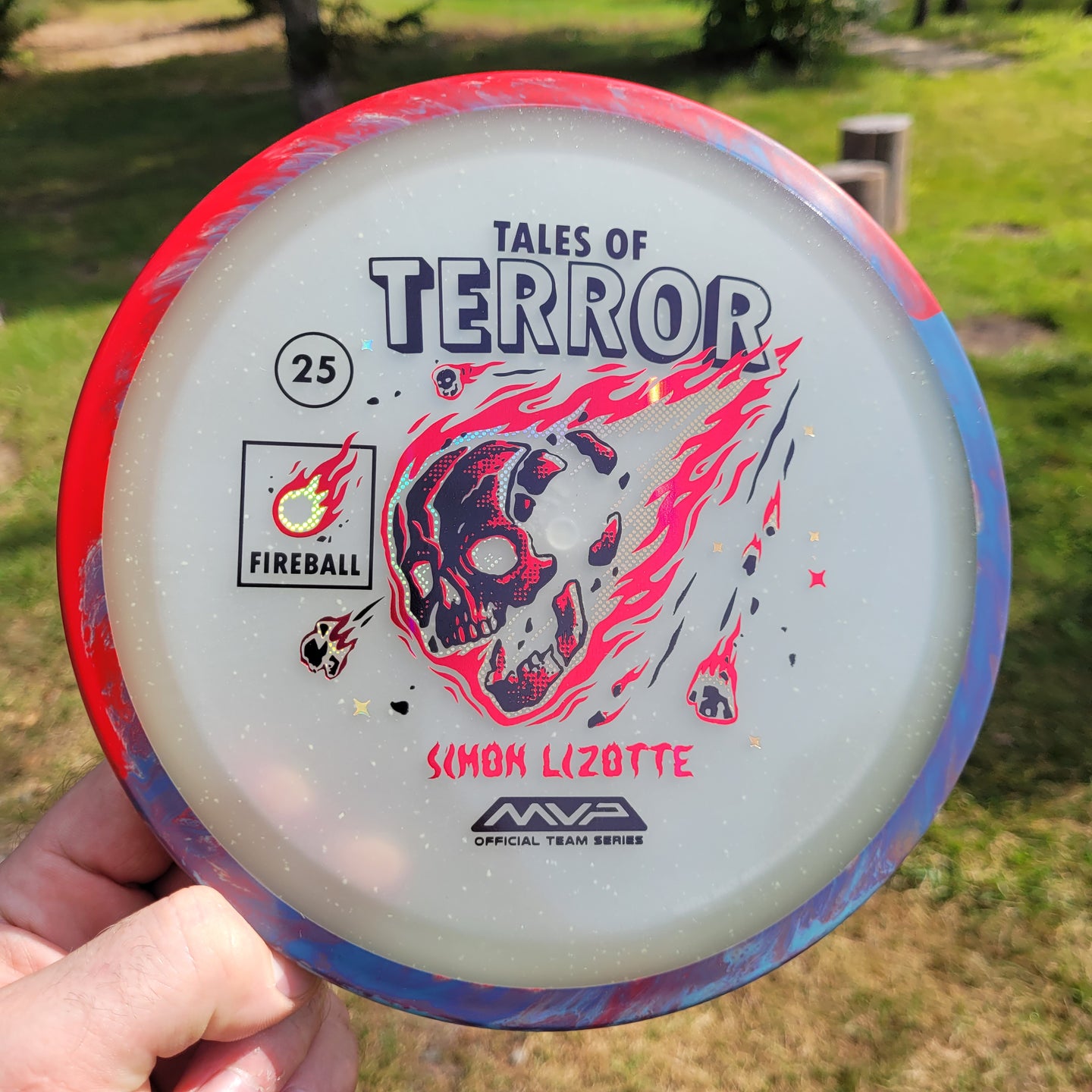 Our first release in our new Particle Eclipse plastic is the Particle Eclipse Fireball! Hurtling towards a catastrophic fate in this stamp brought to us by Matthew Jorde, this flaming doom has never looked better. Made with our industry-leading Eclipse plastic, this new blend of glow with colorful particles inside accentuates the otherworldly feel of this space faring skull about to rain down upon us. Equally suited to backhands and forehands, the Fireball is an overstable driver perfect for wind fighting and situations when you need the dependable hook of its high fade for accurate placement shots. Wreak havoc on the course by grabbing your own Particle Eclipse Fireball today!