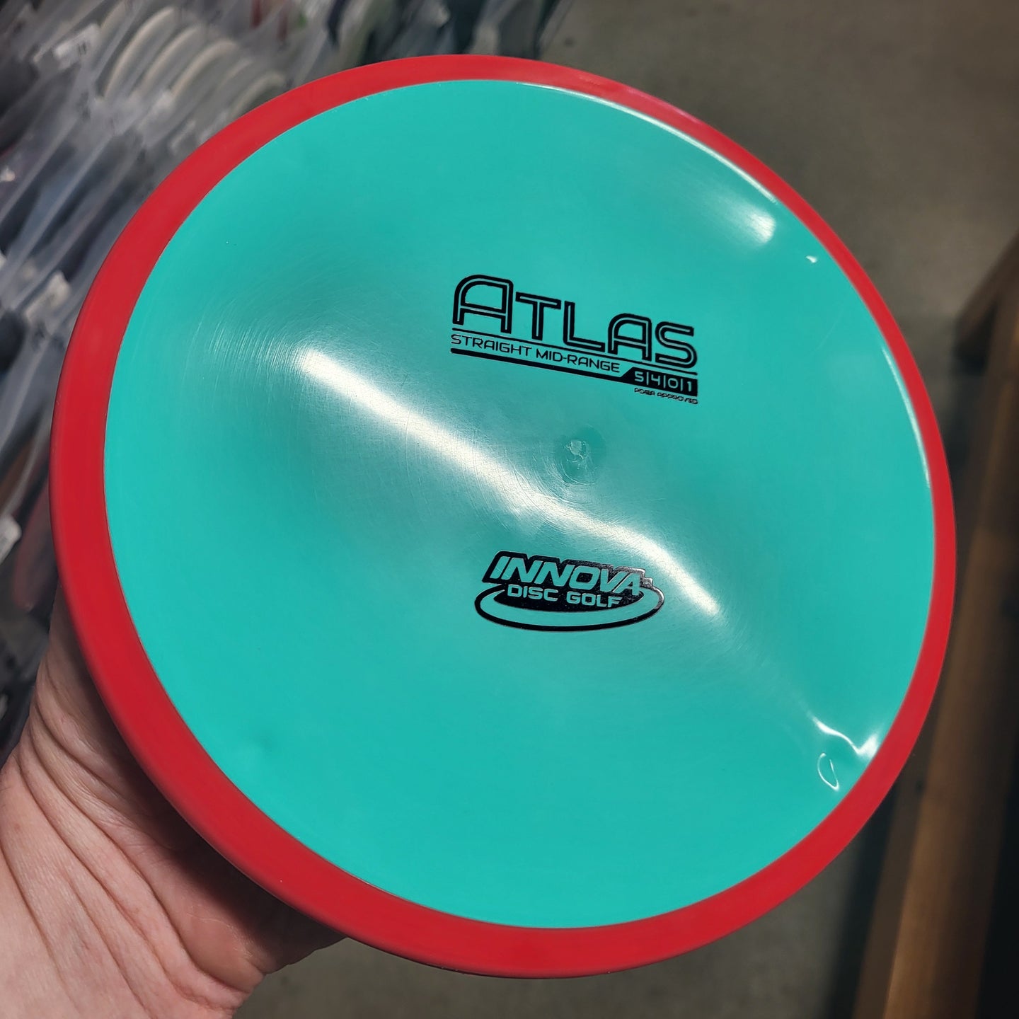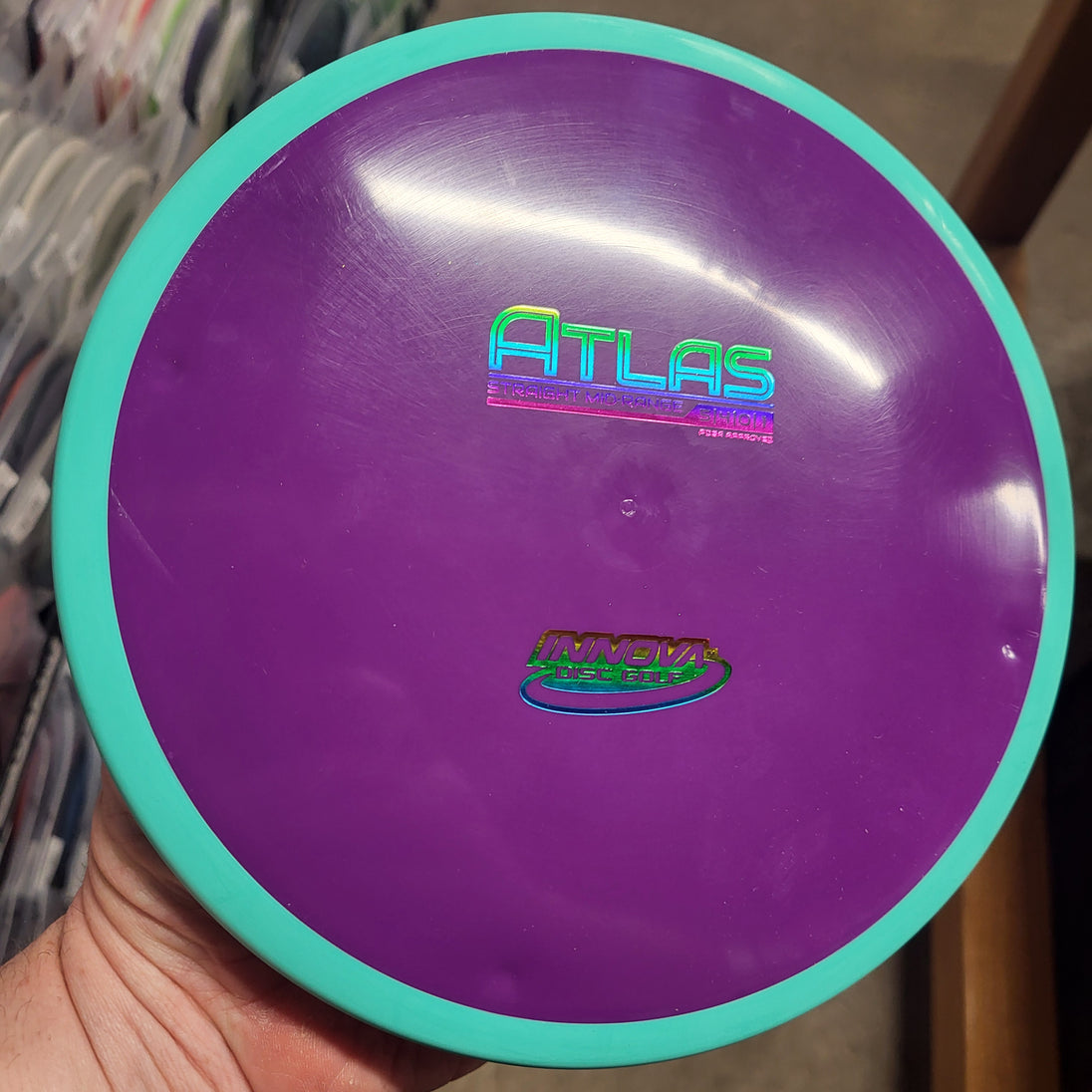 The Atlas is an overmold that combines a firm, low-profile flight plate with a grippy rim. This Mid-Range flies straight with minimal fade, combining accuracy and control with an ergonomic grip. The Atlas performs well for both backhand and forehand throwers forgiving small throwing errors better than any other Mid-Range. The Atlas features four 'compass points' located on the underside of the disc. These ports are where the rim is injected over the flight plate.